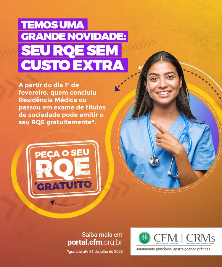 Os Conselhos Federal e Regionais de Medicina (CFM/CRMs) concederão 180 dias de gratuidade para médicas e médicos obterem o Registro de Qualificação de Especialidade Médica (RQE). O benefício vale a partir da próxima quarta-feira (1º) e pode ser solicitado nos CRMs de todos os estados brasileiros.