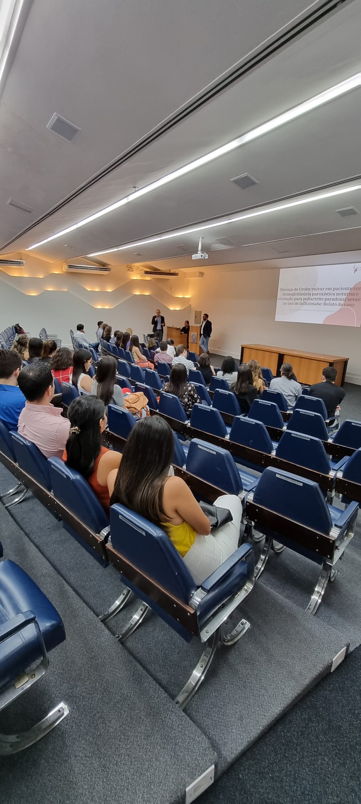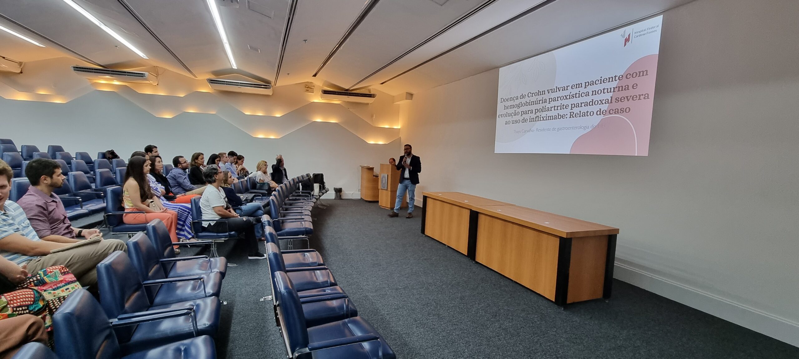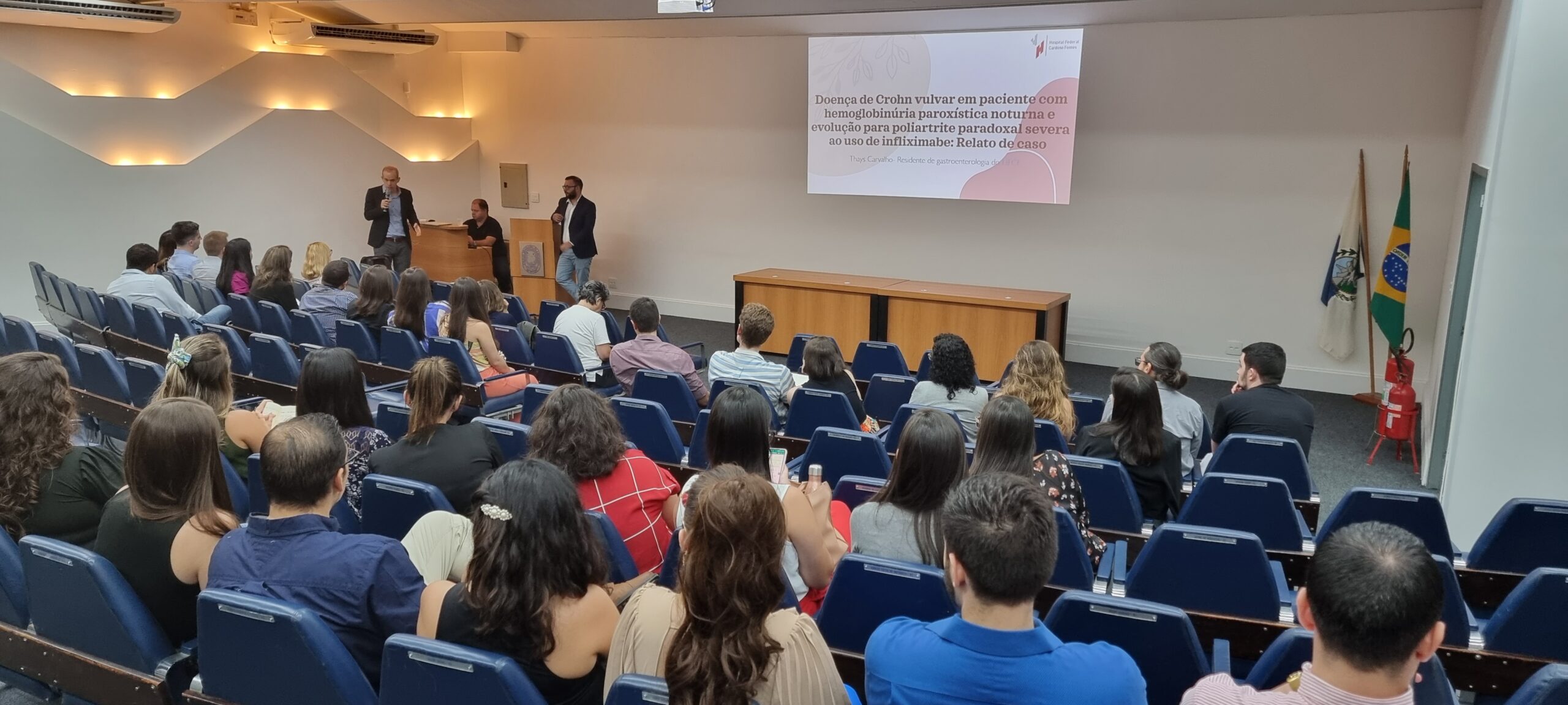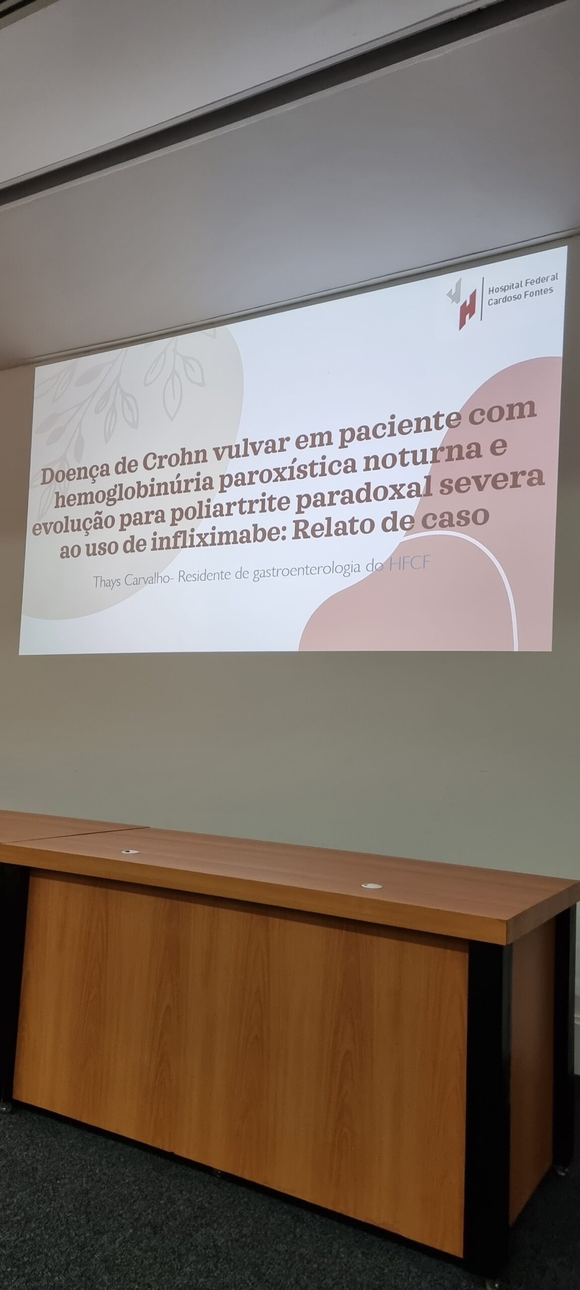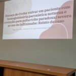 Na sequência, a Dra. Thays Carvalho, residente de Gastroenterologia do Hospital Federal Cardoso Fontes, falou sobre “Doença de crohn vulvar em paciente com hemoglobinúria paroxística noturna e evolução para poliartrite paradoxal severa ao uso de infliximabe: relato de caso”. A orientadora foi a Dra. Rosana da Silva Ciuffo.