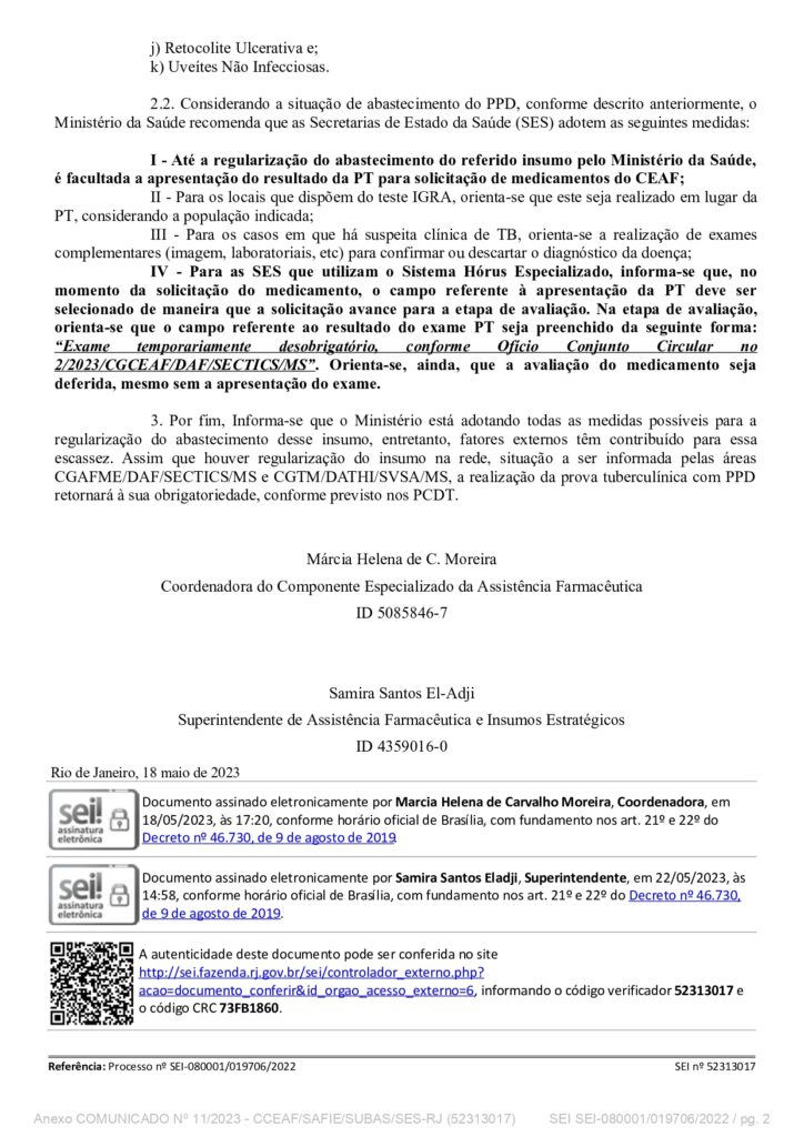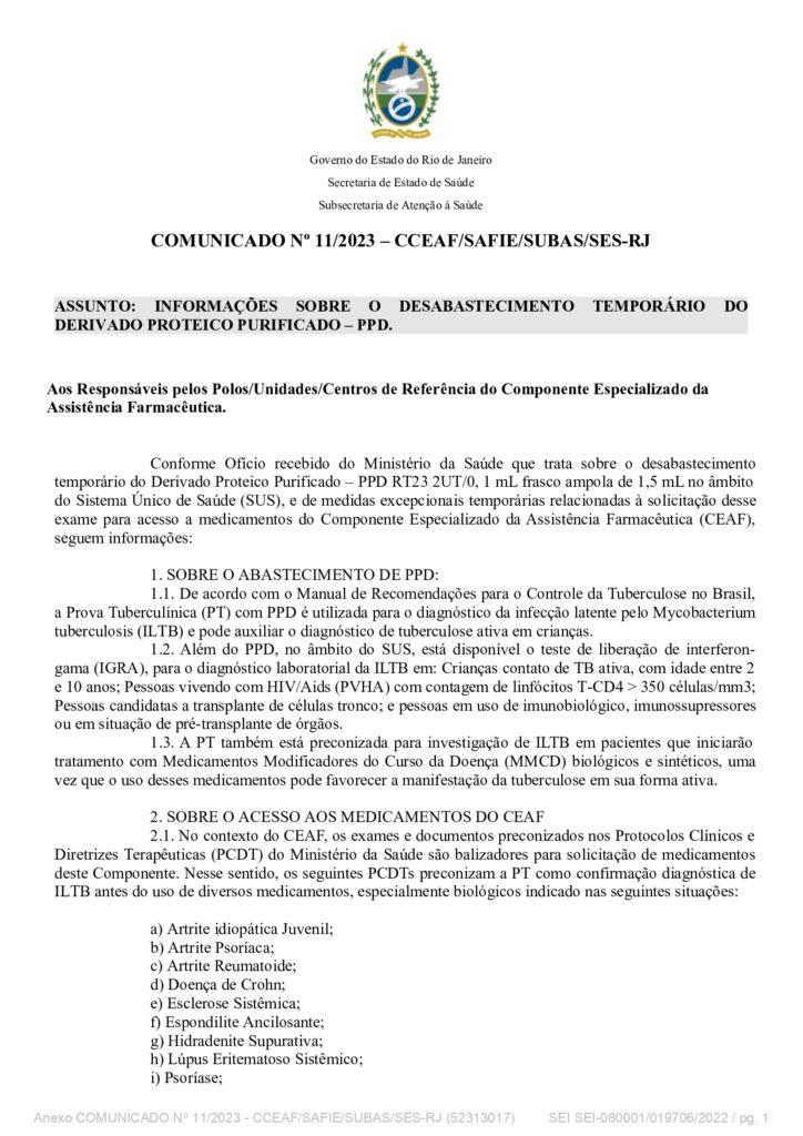 SES/RJ divulga comunicado informando desabastecimento temporário de Derivado Proteico Purificado