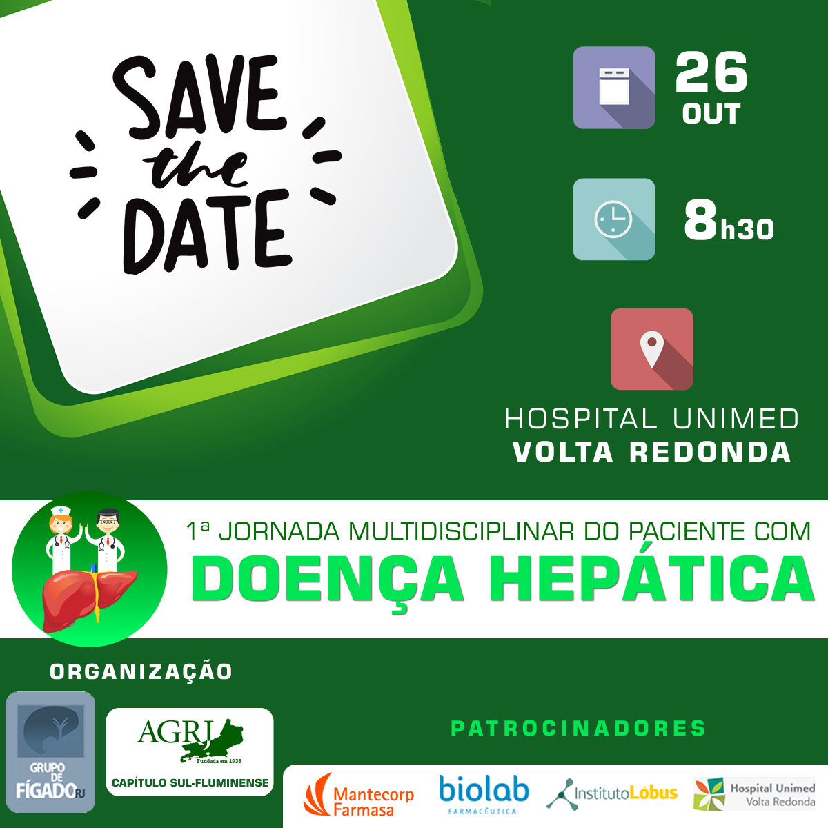 No dia 26 de outubro, sábado, o Capítulo Sul-Fluminense da Associação de Gastroenterologia do Rio de Janeiro e o Grupo de Fígado do Rio de Janeiro realizam a 1ª Jornada Multidisciplinar do paciente com Doença Hepática.