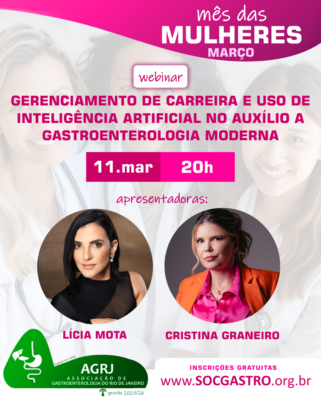 Em comemoração ao mês das mulheres, a AGRJ realizará no dia 11 de março, terça-feira, às 20h, webinar sobre Gerenciamento de Carreira e Uso de Inteligência Artificial no Auxílio a Gastroenterologia Moderna.
