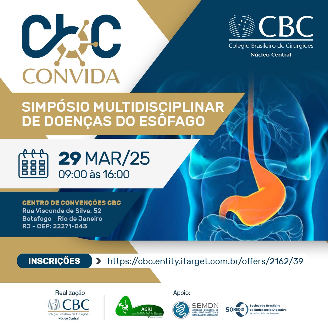 Associados da Associação de Gastroenterologia do Rio de Janeiro contam com valores diferenciados na taxa inscrição do Simpósio Multidisciplinar de Doenças do Esôfago que ocorrerá no dia 29 de março, sábado, das 9h às 16h, no Colégio Brasileiro de Cirurgiões, no Humaitá.