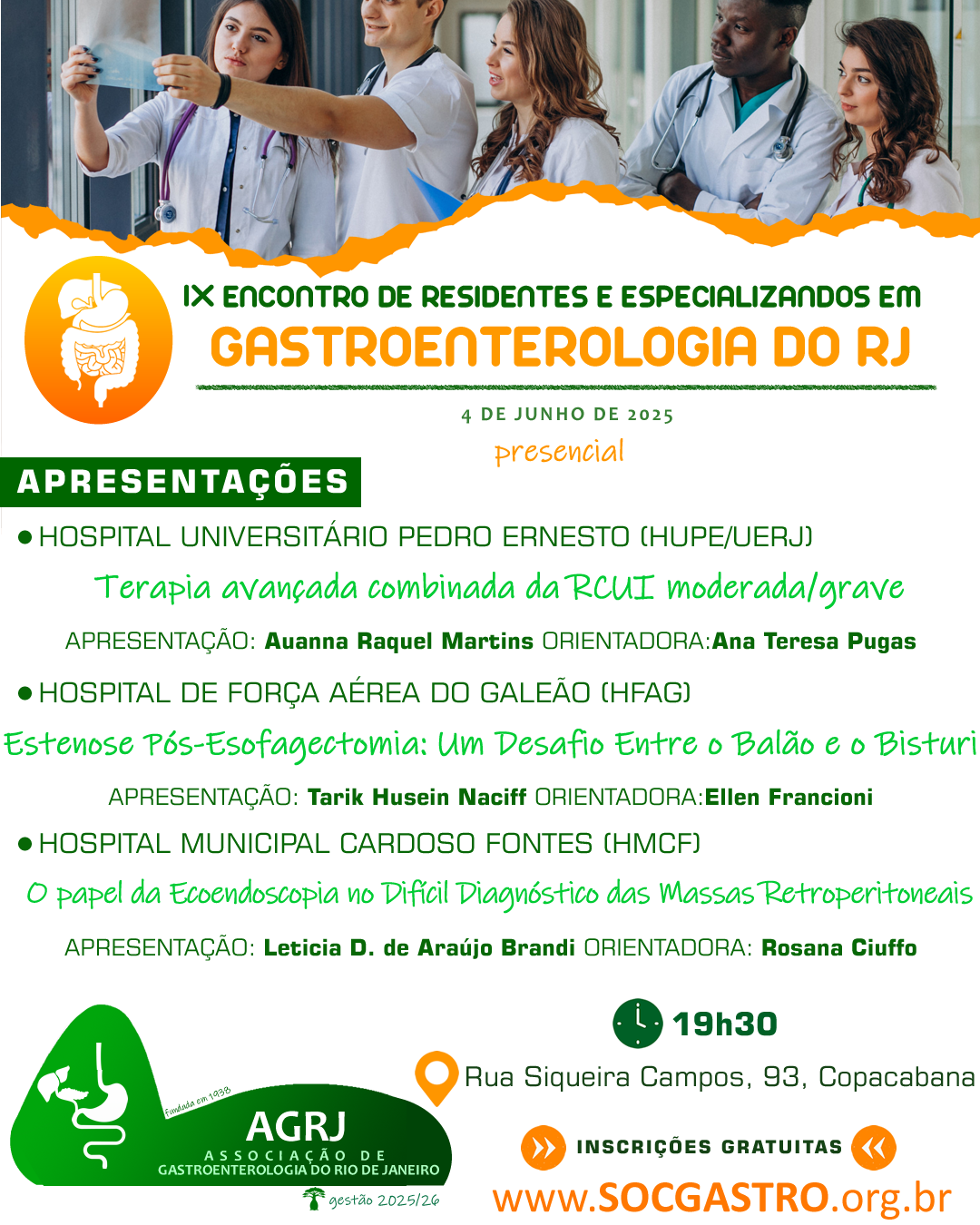 No dia 4 de junho (quarta-feira), às 19h30, ocorre o IX Encontro de Residentes e Especializandos em Gastroenterologia do Rio de Janeiro, que desta vez será presencial: no auditório da AGRJ, situado à Rua Siqueira Campos, 93, em Copacabana (saiba como chegar) .