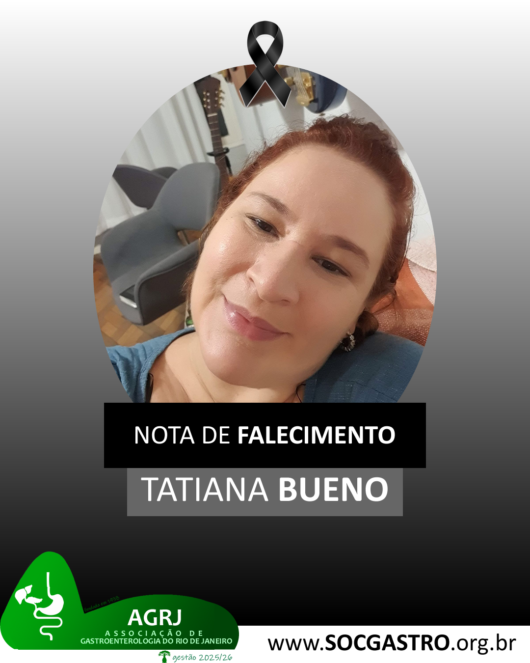 A Associação de Gastroenterologia do Rio de Janeiro comunica, com pesar, o falecimento da Dra. Tatiana Bueno, gastroenterologista e endoscopista, que trabalhava no Rio de Janeiro e em Macaé.