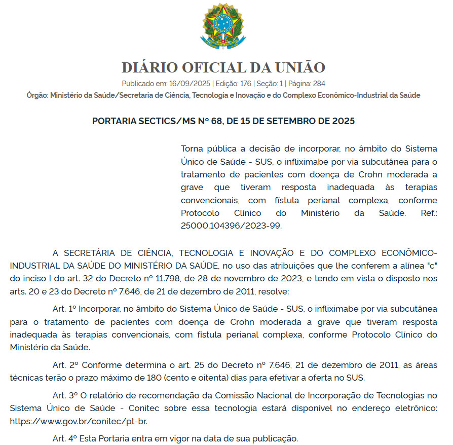 Foi publicada nesta segunda-feira, dia 15, no Diário Oficial da União, a Portaria Sectics/MS nº 68 que torna pública a decisão de incorporar, no âmbito do Sistema Único de Saúde – SUS, o infliximabe por via subcutânea para o tratamento de pacientes com Doença de Crohn moderada a grave que tiveram resposta inadequada às terapias convencionais, com fístula perianal complexa, conforme Protocolo Clínico do Ministério da Saúde.