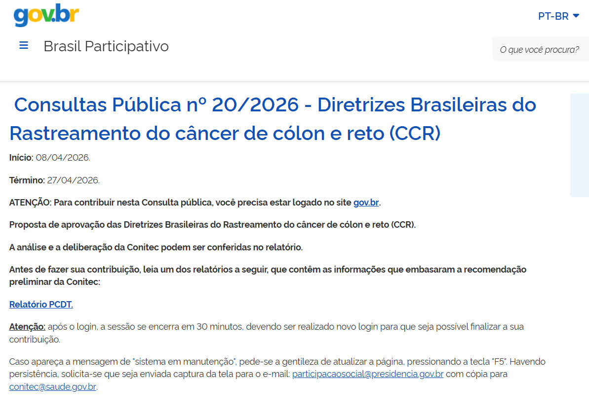 A Consulta Pública nº 20/2026, que trata da aprovação das Diretrizes Brasileiras do Rastreamento do Câncer de Cólon e Reto (CCR), recebe sugestões até o dia 27 de abril.